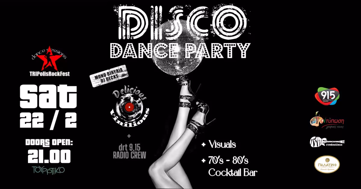 Ένα χορευτικό πάρτυ βγαλμένο από την εποχή της disco, πλημμυρισμένο με ντισκομπάλες, visuals, classic cocktails από τα '70's και '80's, ενώ στα decks τα ηλεκτρόφωνα θα γυρίζουν όλο το βράδυ αποκλειστικά με βινύλια από τους Delicious Vinilious.